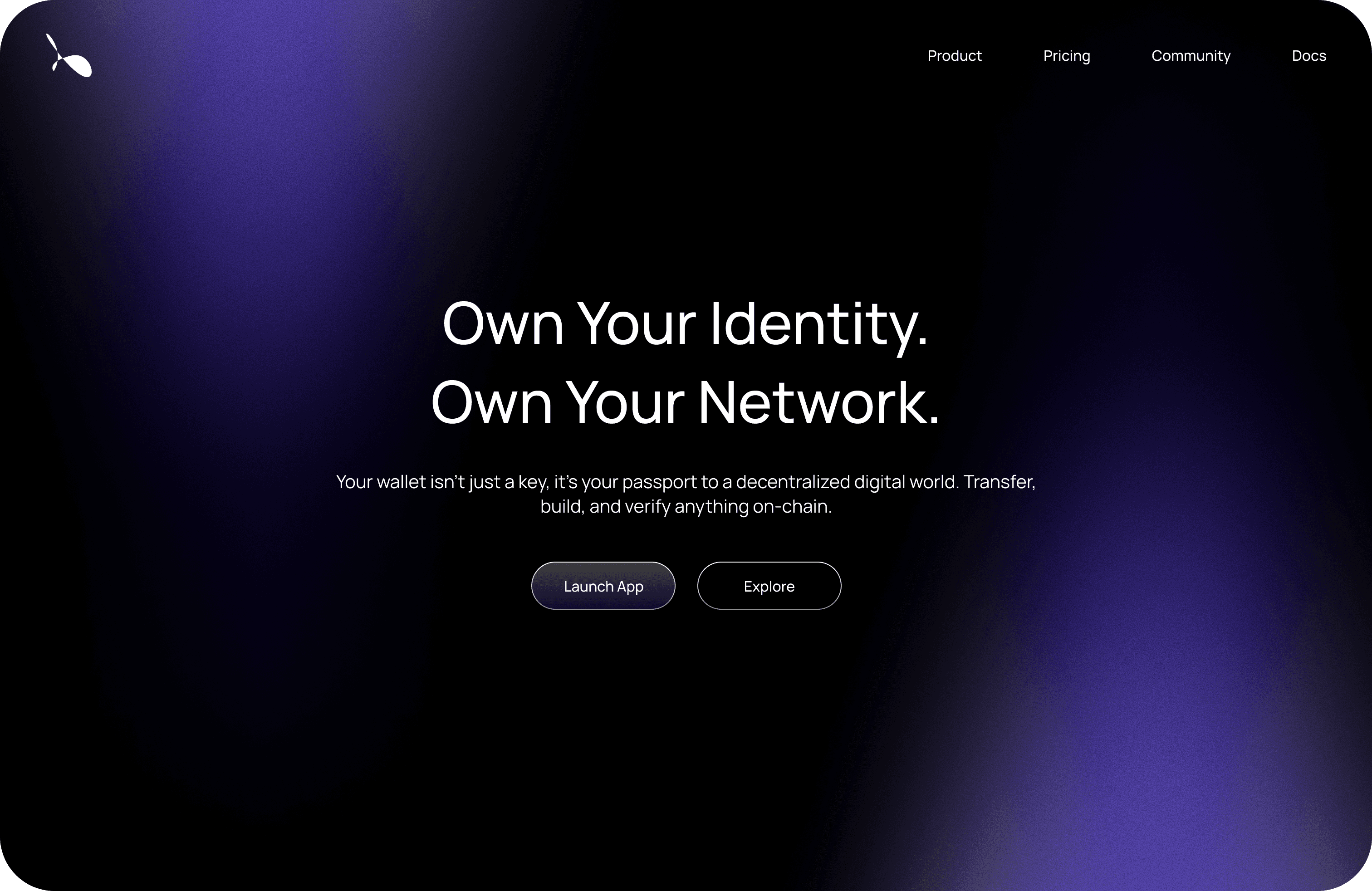 The layout uses a centered visual hierarchy to keep focus on the product promise. A soft, futuristic gradient background supports the theme of decentralization and secure connectivity. Typography is clean and bold, using scale to differentiate core messaging from description and actions.